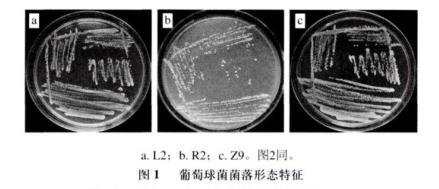 由图1可知,葡萄球菌菌株L2、R2及Z9在NB固体培养基上37℃培养24 h,菌落直径约1~2 mm,菌落形态均呈白色圆形,不透明,形状规则,其中L2、R2菌落光滑、湿润、呈凸起状,Z9菌落边缘粗糙,质地干燥且菌落比较扁平。