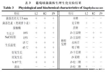 由表3可知,参考《常见细菌系统鉴定手册》,根据葡萄球菌生理生化鉴定结果,初步推断葡萄球菌菌株L2、Z9为腐生葡萄球菌,R2为肉葡萄球菌。