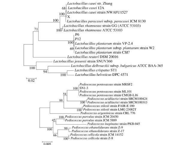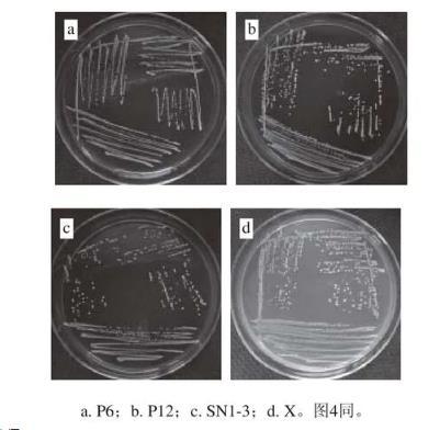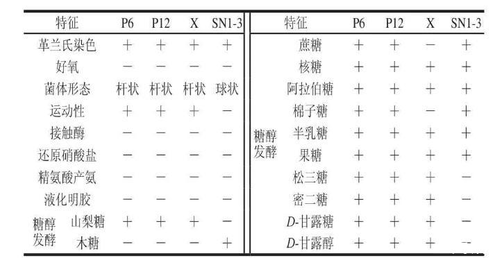 由表4可知,参考《常见细菌系统鉴定手册》和《乳酸细菌现代研究实验技术》,根据乳酸菌菌株的生理生化鉴定结果,初步推断乳酸菌菌株P6、P12为植物乳杆菌或鼠李糖乳杆菌、X为干酪乳杆菌、SN1-3为戊糖片球菌。