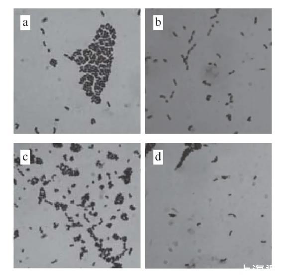 由图4可知,经革兰氏染色后在显微镜下观察,乳酸菌菌株P6细胞成对或成短链,革兰氏阳性,粗短杆状;菌株P12成对或成短链,为革兰氏阳性短杆菌;菌株SN1-3细胞部分以直二个方向形成四联排列,为革兰氏阳性球菌;菌株X成对或成短链,为革兰氏阳性杆菌。