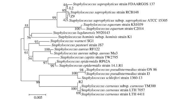 图6葡萄球菌菌株L2、R2、Z9的系统发育树