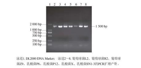 综合生理生化及分子生物学鉴定,结果表明,葡萄球菌菌株L2、Z9为腐生葡萄球菌,葡萄球菌菌株R2为肉葡萄球菌;乳酸菌菌株P6、P12为植物乳杆菌,菌株X为干酪乳杆菌,SN1-3为戊糖片球菌。