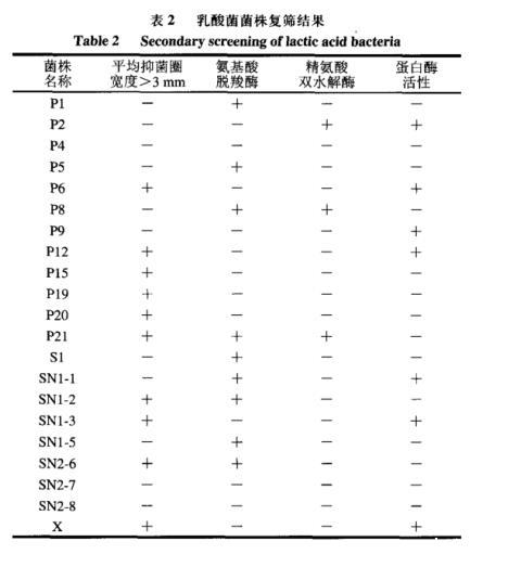 对初筛所得的21株乳酸菌进行复筛,经过抑菌实验,所有菌株均对大肠埃希氏菌、金黄色葡萄球菌、单增李斯特菌、蜡样芽胞杆菌有抑制作用。由表2可知,根据抑菌圈的大小,其中10株乳酸菌的抑菌作用最强(抑菌圈平均宽度大于3 mm)。在进行复筛的21株菌中,氨基酸脱羧酶阴性的菌株有12株,精氨酸双水解酶阴性的菌株有18株,具有蛋白酶活性有7株。因此,最终筛选出4株兼具多种优良特性的乳酸菌菌株,分别为筛选自郭三酸菜的P6与P12、筛选自北京紫光园自制酸乳的SN1-3以及筛选自一口酸牛奶自制乳酸菌饮料的X。