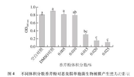 图4不同体积分数香芹酚对恶臭假单胞菌生物被膜产生能力的影响