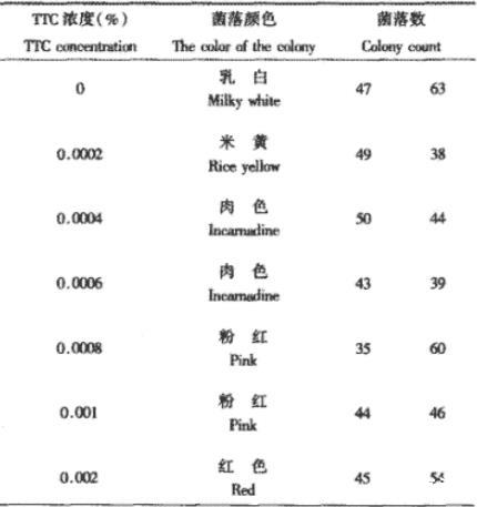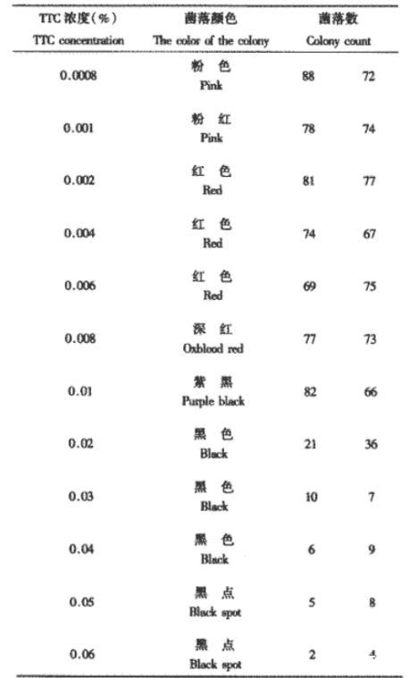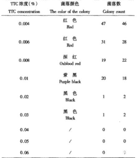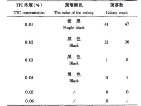 金黄色葡萄球菌在不同TTC浓度试验组中,菌落颜色变化和大肠埃希菌组相同,只是在TTC终浓度≤0.004%时,菌落数量和对照组基本相当;TTC终浓度≥0.006%时,菌落数量明显减少;TTC终浓度≥0.02%时,几乎无菌落出现(表2)。
