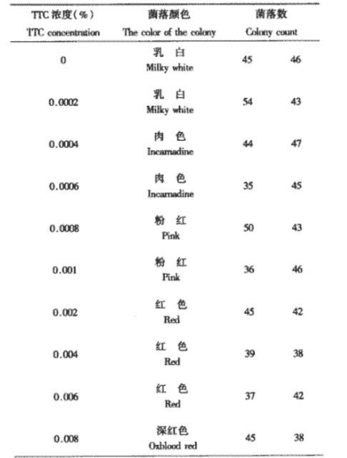 表1不同TTC浓度计数琼脂培养基中大肠埃希菌生长检测结果