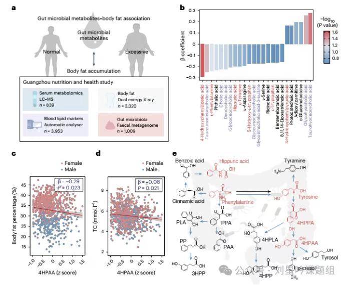该研究基于广州营养与健康研究(GNHS)队列的数据,通过评估血清中微生物相关代谢物与人体不同区域的脂肪百分比之间的关联(图1a),发现8个参与胆汁酸代谢途径的分子和7个与AAA代谢途径相关的分子均与脂肪堆积有关。AAA代谢途径中的7个分子分别为:4HPAA(图1c)、Phe、Tyr、马尿酸、5-羟色氨酸和Trp,均与肥胖呈负相关;而4-羟基苯丙酮酸与肥胖呈正相关。进一步作者研究发现,在排除年龄,性别,饮食等因素后,4HPAA与全身脂肪积累、总胆固醇浓度呈现最明显的负相关。且作者发现,4HPAA不仅能减少内脏脂肪堆积,还可降低血液中总胆固醇和低密度脂蛋白LDL-C(图1b-d)。
