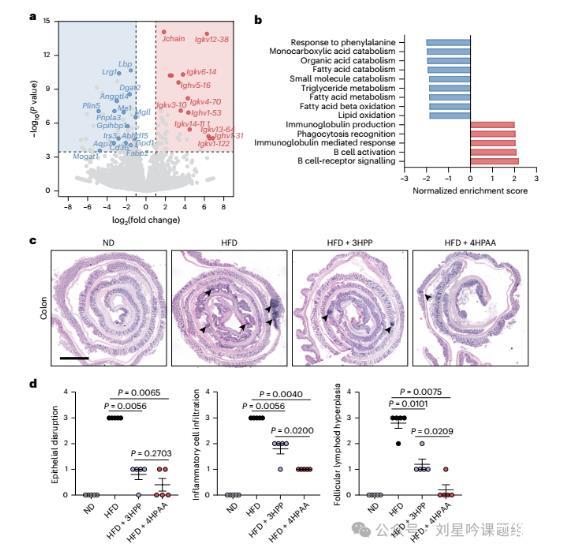 为探究AAA及其代谢物是如何作用于肠道从而发挥抗肥胖的作用,研究则将饮用4HPAA及纯水的HDF引起的肥胖小鼠的肠道组织进行转录组学分析。结果显示,结肠组织中有42个上调和64个下调的转录本。基因集富集分析表明参与脂质代谢的途径,包括单羧酸分解代谢、脂肪酸分解代谢、甘油三酯代谢、脂肪酸代谢和脂质氧化等途径均被抑制,编码免疫球蛋白或B细胞信号因子相关代谢通路上调。其中参与脂质代谢的基因Scd1,Lpl,Aqp7,Fabp2 and Cd36表达也显著下调(图7a-b),但是体外使用4HPAA及3HPP直接刺激小鼠肠道类器官,发现这些基因并未有显著变化,故作者认为4HPAA及其衍生物不直接作用于肠上皮细胞来发挥作用。进一步作者研究发现,4HPAA可以减少肠道炎症细胞浸润,恢复肠道屏障完整性(图7 c-d)。
