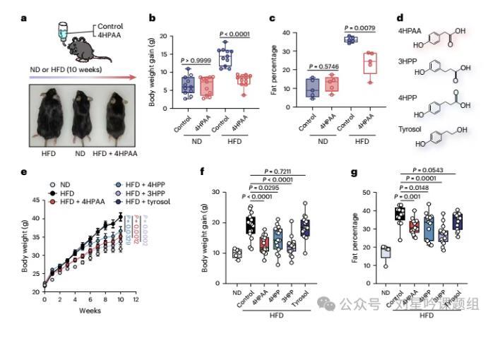 为了进一步去验证4HPAA是否可以影响小鼠的脂肪含量,研究者将4HPAA添加到正常小鼠及高脂饮食(HDF)造成的肥胖小鼠饮水中(图2a)。结果显示,4HPAA可以显著抑制了HFD小鼠体重和脂肪百分比的增加(图2b-c)。为了进一步去验证4HAPP的羟基化合物是否也有类似的功能,作者给正常小鼠及HDF饮食造成的肥胖小鼠饮用4HPP、3HPP和Tyrosol,结果显示与4HPAA结构相关的代谢产物4HPP和3HPP也展现出类似的抗肥胖作用(图2e-g)。