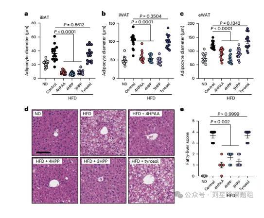 为了观察4HPAA对脂肪组织形态的改变,作者对多种脂肪组织进行HE染色。结果显示,4HPAA、3HPP、4HPP可抑制HFD喂养小鼠的肩胛骨间棕色脂肪组织(iBAT)、腹股沟白色脂肪组织(iWAT)和附睾白色脂肪组织(eWAT)中的脂肪细胞肥大(图3a-c)。已知HDF饮食造成的肥胖往往伴随着肝脂肪性病变,作者的进一步研究发现,4HPAA、3HPP、4HPP不仅可以抑制脂肪细胞肥大,也能抑制肝脂肪性病变。以上结果表明4HPAA及其结构类似物可改善肥胖小鼠的脂肪细胞肥大和肝脏组织脂肪变性。