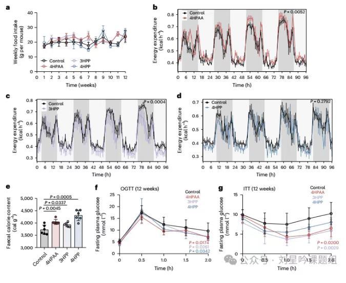 为了探究4HPAA及其衍生物如何减轻HDF诱导的小鼠肥胖,作者检测了小鼠饮食摄入量,能量的消耗及小鼠能量的吸收。研究结果发现,与对照小鼠相比,饮用4HPAA、3HPP、4HPP的小鼠,食物的摄入无明显改变(图4a),同时小鼠能量消耗仅略增高(图4b-d)。但是饮用4HPAA、3HPP、4HPP的小鼠对食物能量的吸收明显降低(图4e)。同时作者也观察到小鼠血糖水平降低(图4f-g)。以上结果提示我们,4HPAA及其衍生物可能通过抑制HFD小鼠肠道营养吸收,来减轻HDF诱导的小鼠肥胖。