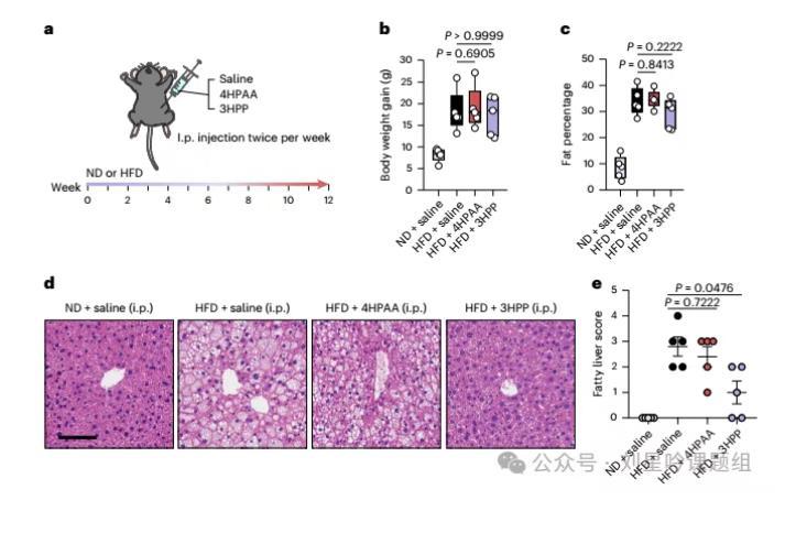 为探究AAA代谢物是作用于肠道,还是进入血液循环从而靶向远处器官如肝脏和脂肪组织来发挥抗肥胖作用。研究者通过给HDF饲喂小鼠腹腔注射4HPAA及衍生物来探究这一作用机制(图5a)。结果发现,虽然腹腔注射4HPAA或3HPP可以减轻肝脏脂肪性病变,但是无法减少高脂饮食小鼠体重增加和脂肪积累(图5b-e)。以上结果表明肠道才是这些代谢物发挥抑制脂肪堆积作用的关键位置。