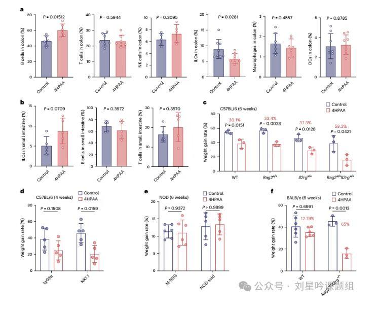 为进一步探究4HPAA对肠道免疫细胞的影响,研究者分析了小鼠结肠及小肠中的各类免疫细胞组成。结果发现将4HPAA干预后小鼠结肠中ILCs细胞减少,而在小肠中少量增加(图8a,b)。为了进一步研究4HPAA是否通过免疫调节减轻了HFD诱导的体重增加,研究者使用了多种免疫缺陷的小鼠模型,结果显示ILCs及NK细胞在4HPAA诱导的抗肥胖作用中发挥着重要的抑制4HPAA的作用(图8c)。进一步研究者通过使用IgG2α对照或抗NK1.1抗体,以耗尽NK和ILC1细胞进一步证实这一猜想(图8d)。最后,研究者发现不同背景的小鼠对4HPAA的敏感性不同(图8e,f)。