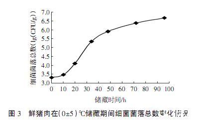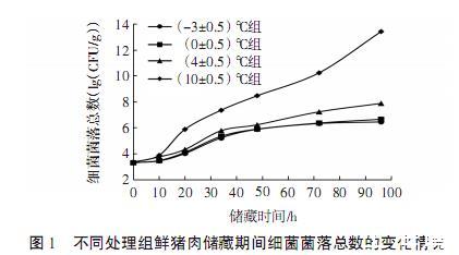 储藏时间/h0(-3±0.5)℃组(0±0.5)℃组(4±0.5)℃组(10±0.5)℃组100 10 20 30 40 50 60 70 80 907.06.56.05.55.04.54.03.53.0细菌菌落总数(lg(CFU/g))
