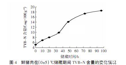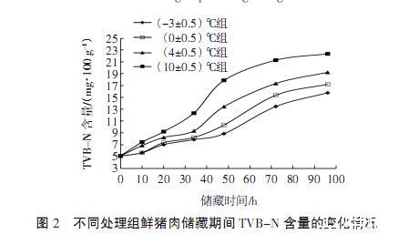 储藏时间/h0(-3±0.5)℃组(0±0.5)℃组(4±0.5)℃组(10±0.5)℃组100 10 20 30 40 50 60 70 80 9025232119171513119753 TVB-N含量/(mg·100 g-1)
