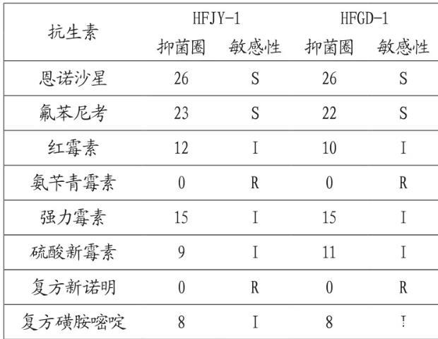 使用水产养殖中常用的氟苯尼考、恩诺沙星、强力霉素、硫酸新霉素、土霉素、红霉素、复方新诺明和复方磺胺嘧啶等8种抗生素对分离到的两株致病菌进行药敏实验,药敏实验结果见表2,结果表明,分离的嗜水气单胞菌对恩诺沙星、氟苯尼考敏感,红霉素、强力霉素、硫酸新霉素和复方磺胺嘧啶中度敏感,对复方新诺明和氨苄青霉素耐药。