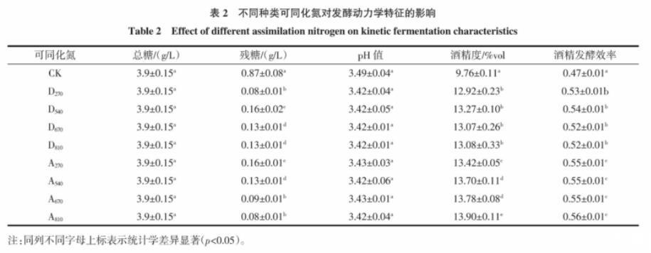 本研究采用贵州省麻将地区圆蓝蓝莓作为原材料,通过添加不同种类(DAP、FAN)、不同浓度(270、540、670、810 mgN/L)可同化氮进行果酒发酵,首次比较了不同种类可同化氮对蓝莓果酒酒精发酵和果酒品质的影响。研究结果表明,添加可同化氮可显著提高酵母生长速率、酒精度及酒精发酵效率,添加不同种类可同化氮未对酵母生长产生不同影响;添加FAN果酒酒精度、酒精发酵效率均高于相同浓度DAP果酒;添加FAN果酒醇类含量高于添加DAP及未添加可同化氮果酒,添加不同浓度DAP果酒醇类总量先增加后减少,添加FAN可使增加异戊醇与异丁醇含量增加,添加270、540 mgN/L DAP可使异戊醇、异丁醇、正丙醇含量增加,添加670、810 mgN/L DAP可使正丁醇含量显著增加,其余醇类含量显著减少;添加DAP或FAN均可增加果酒酯类含量,添加DAP可使乙酸乙酯、己酸乙酯含量显著增加,添加FAN可使乳酸乙酯含量显著增加。综上所述,本研究认为蓝莓果酒初始发酵液中可同化氮含量达到270 mgN/L即可提高酵母生长速率,增加酒精度及发酵效率,增加醇类与酯类物质含量;相同浓度不同种类可同化氮对酒精发酵影响无显著差异;但相同浓度不同种类可同化氮对果酒品质影响存在差异。