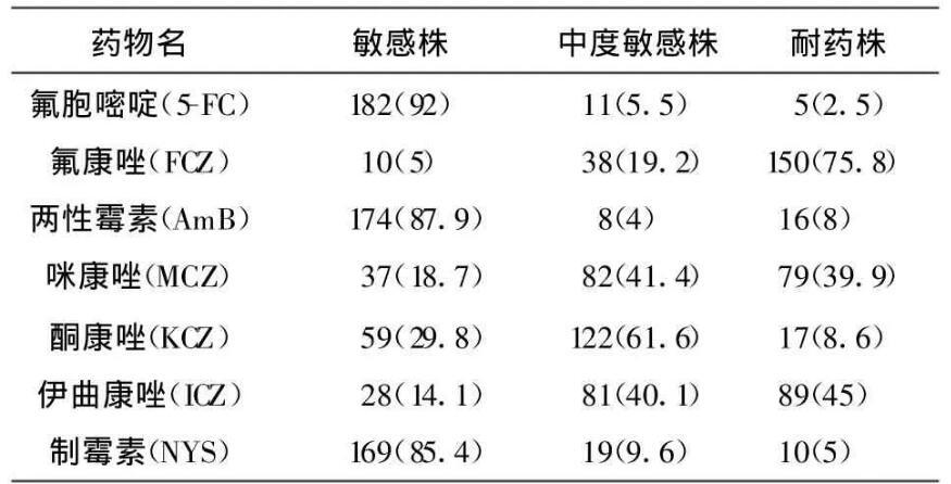 对198株白色念珠菌进行药物敏感试验,药物敏感性由高到低为:氟胞嘧啶(92%)、两性霉素(87.9%)、制霉素(85.4%)、酮康唑(29.8%)、咪康唑(18.7%)、伊曲康唑(14.1%)、氟康唑(5%);耐药性由低到高为:氟胞嘧啶(2.5%)、制霉素(5%)、两性霉素(8%)、酮康唑(8.6%)、咪康唑(39.9%)、伊曲康唑(45%)、氟康唑(75.8%),见表2。