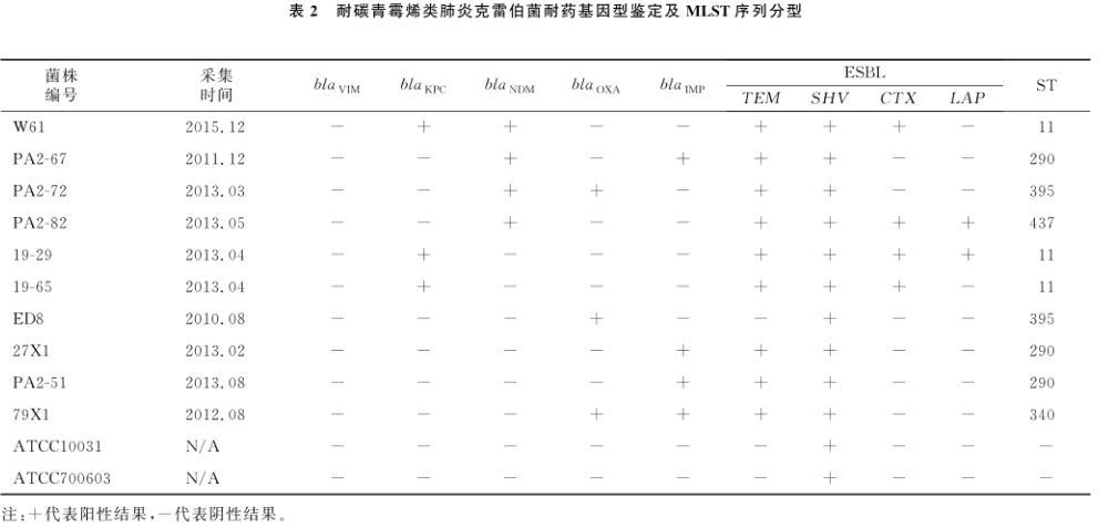 表2耐碳青霉烯类肺炎克雷伯菌耐药基因型鉴定及MLST序列分型