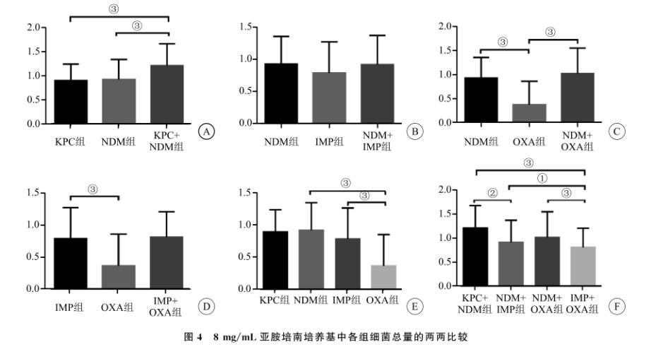 图4 8 mg/mL亚胺培南培养基中各组细菌总量的两两比较