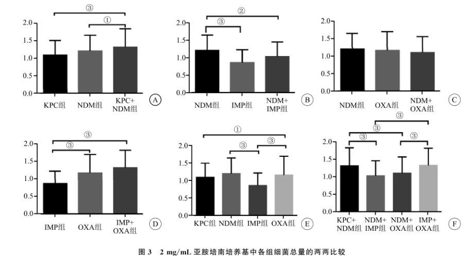 图3 2 mg/mL亚胺培南培养基中各组细菌总量的两两比较