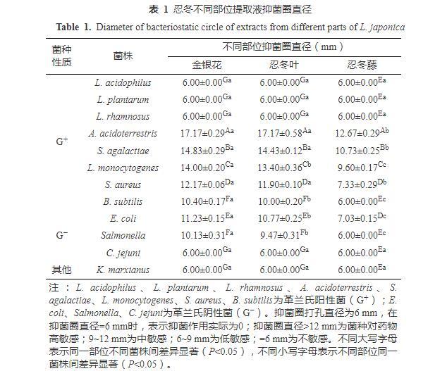另外,忍冬提取液虽然对革兰氏阳性菌敏感,但对L.acidophilus、L.plantarum和L.rhamnosus这三株益生菌均无抑制特性,这对忍冬精深加工及药物开发具有重要意义,其机理特性有待于进一步研究。