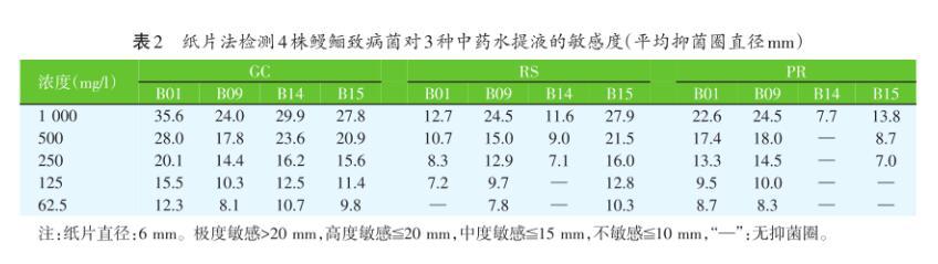 表2纸片法检测4株鳗鲡致病菌对3种中药水提液的敏感度(平均抑菌圈直径mm)