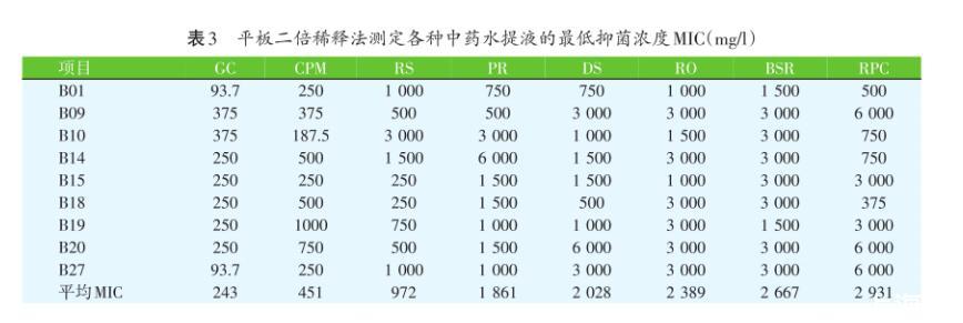 表3平板二倍稀释法测定各种中药水提液的最低抑菌浓度MIC(mg/l)
