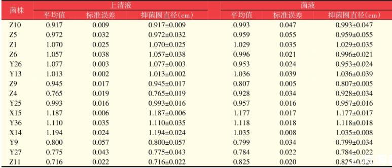 通过用牛津杯法直接测量抑菌圈直径大小,并经过计算机数据分析,计算均值及标准误差如表1所示,可间接得出酶标法测得的16株试验拮抗菌对指示菌哈维氏弧菌的拮抗效果,从而确定最佳目的拮抗菌为X14菌株和X15菌株。