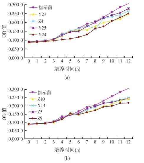 用点种法在实验室保存的65株未知的海洋微生物菌株中,获得18株出现抑菌圈的初筛拮抗菌。酶标法复筛,从生长曲线对比图1(a,b,c,d)可看出各试验菌的拮抗效果。在试验菌发酵上清液拮抗下的指示菌生长曲线居于空白指示菌生长曲线之下的均可能存在拮抗效果。因此,初步确定X15、Y13、Y26、Y36、Z10、X14、Z5、Z9、Y9、Z11、Y27、Z4、Y25、Y24、Z6、Z1具有对指示菌哈维氏弧菌的拮抗作用。