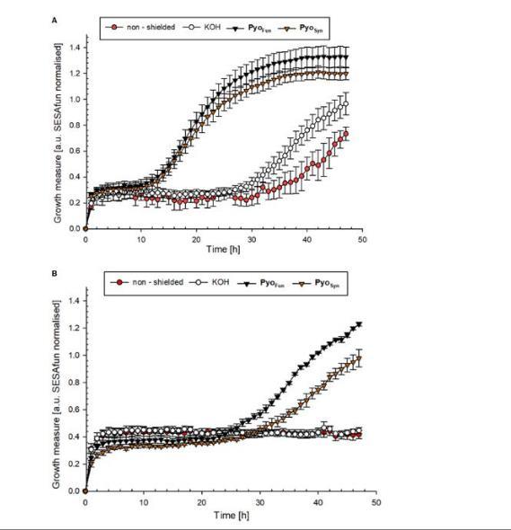 图5、幽黑素对UV-C辐射的防护能力。应用ocelloScope展示了黑曲霉野生型(N402)和DHN-黑色素缺陷型(MA93.1)孢子在经过PyoFun和PyoSyn?;ず?,对UV-C辐射的耐受性的生长过程。结果显示,PyoFun显著提高了孢子的生存率,尤其是在DHN-黑色素缺陷型菌株中。