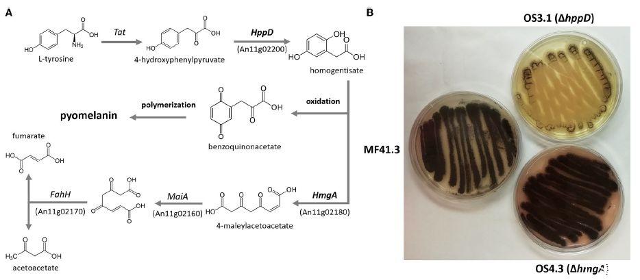 图2、A)幽黑素生物合成途径;(B)黑曲霉菌株的生长表型。图(A)展示了黑曲霉中幽黑素形成的生物合成途径,包括关键基因和代谢产物。图(B)展示了在含有L-酪氨酸的培养基中培养时,野生型和基因敲除突变株(hppD和hmgA)的生长表型差异。