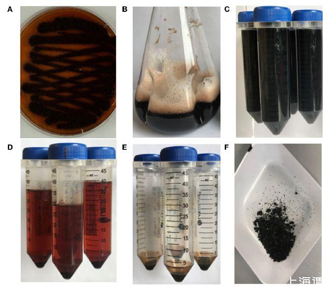 图3、黑曲霉中幽黑素的生产和纯化。展示了黑曲霉菌株OS4.3在含有L-酪氨酸的培养基中培养后,通过酸化和冷冻干燥步骤纯化出的幽黑素(PyoFun)的过程。