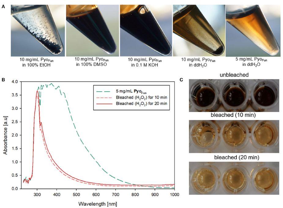 图4、幽黑素的物理化学特性。展示了PyoFun在不同溶剂中的溶解性测试结果,以及在过氧化氢处理后的褪色情况,表明PyoFun具有抗氧化活性。