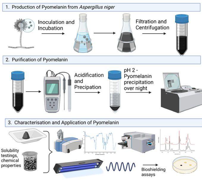图1、研究的实验工作流程图。展示了研究的整体流程,包括黑曲霉菌株的培养、幽黑素(PyoFun)的生产、纯化、光谱分析、抗氧化测试以及辐射屏蔽测试等步骤。