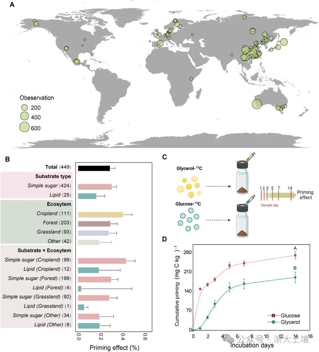 写在前面土壤激发效应(priming effect)是指外源碳源输入引发土壤有机碳(SOC)矿化速率变化的现象,在全球碳循环中具有重要意义。然而,不同类型碳源输入所引起的激发效应强度差异,背后的微生物机制尚不清晰。尤其是微生物如何以不同代谢策略应对差异碳源(如糖类与脂类),进而调控激发效应强弱与最终固碳效应,仍缺乏规律与机制的认识。基于此,浙江大学徐建明团队通过整合全球449组数据的Meta分析与13C标记同位素探针-宏基因组(SIP-Metagenomics)实验,系统比较了糖类(以葡萄糖为代表)与脂类(以甘油为代表)碳源引发激发效应的差异及其微生物驱动的代谢机制。研究以“Deciphering microbial metabolisms underlying substrate-specific soil priming effects”为题发表在国际土壤权威期刊《Soil Biology and Biochemistry》上(https://doi.org/10.1016/j.soilbio.2025.109885),论文第一作者是浙江大学土水资源与环境研究所博士后符颖怡,通讯作者是浙江大学罗煜副教授。主要结果-01-全球尺度上糖类碳源激发效应更强通过对全球449组实验的Meta分析,发现糖类碳源平均引发的激发效应达35.96%,显著高于脂类碳源的18.18%。这一趋势在同位素标记的短期孵育实验中亦得到验证:在14天的孵育过程中,添加葡萄糖的处理释放的CO2始终高于甘油处理。这表明糖类碳源更易被微生物迅速利用,进而引发SOC矿化。