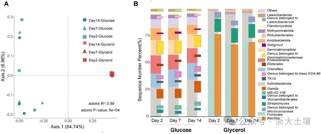 DNA-SIP结合16S rRNA测序结果显示,利用葡萄糖的微生物群落多样性明显高于利用甘油的群落,且群落结构在不同碳源处理间存在显著分化。葡萄糖利用者分布于多个门类,主要包括放线菌门(Actinobacteria)和变形菌门(Proteobacteria);而甘油利用者则主要集中在厚壁菌门(Firmicutes),以芽孢杆菌(Bacillus)和链霉菌(Streptomyces)为代表。这表明不同碳源具有显著的微生物选择效应,导致微生物群落组成发生系统性变化。