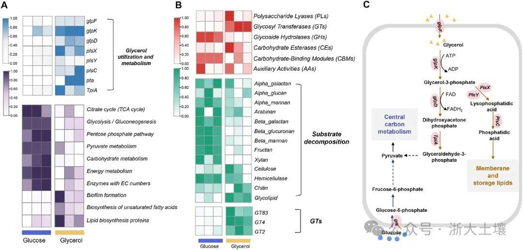 微生物代谢模式的差异是激发效应强弱的关键机制SIP-宏基因组功能结果表明,葡萄糖处理显著富集了与糖代谢和能量生成相关的核心代谢通路(包括糖酵解、柠檬酸循环、戊糖磷酸途径等),并伴随着糖苷水解酶(GHs)等胞外酶合成基因的明显增加,表明其微生物群落具有更强的有机碳分解能力。相比之下,甘油利用者更偏向于胞内物质的合成代谢,群落中富集了甘油运输与代谢相关基因(如glpF、glpK、glpD等),以及多种糖基转移酶(GT2、GT4、GT83等),主要参与细胞膜脂、糖复合物等结构性物质的生物合成。
