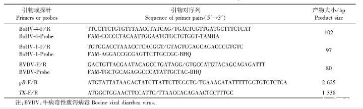 使用本实验室前期设计的BoHV-4、BoHV-1、BVDV(牛病毒性腹泻病毒)的qPCR引物;同时根据GenBank中的BoHV-4全基因组序列,设计扩增gB和TK基因的特异性PCR引物。引物信息见表1,引物均由生工生物科技有限公司合成。