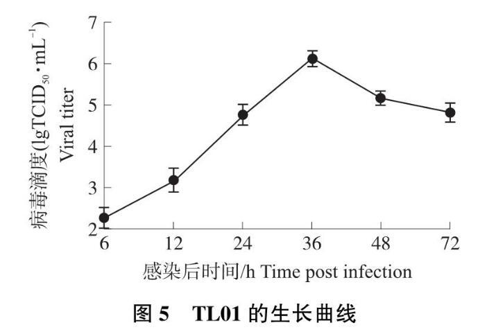 为测定病毒生长动力学,HeLa细胞在指定时间点以MOI为0.1接种TL01。病毒滴度在6~36 h呈上升趋势,在感染后36 h达到峰值(106.3 TCID50·mL-1)后下降(图5),表明TL01可以在HeLa细胞中有效感染和复制。