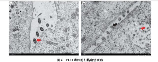 收集病毒感染后的细胞固定后制作超薄切片,电镜图片如图4所示。在电子显微镜下可观察到明显的球形颗粒,有囊膜,包装完整的病毒粒子大小为150~200 nm,符合疱疹病毒的形态特征。图4中可观察到细胞质中包装完整的病毒颗粒以及包装完成后即将释放到细胞间隙的病毒颗粒。
