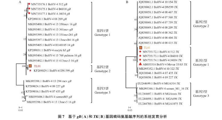 图7基于gB(A)和TK(B)基因编码氨基酸序列的系统发育分析
