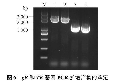 对TK和gB基因进行扩增,电泳鉴定结果如图6所示,TL01各基因片段与预期相符。对胶回收产物纯化后测序获得TL01的TK(GenBank ID:PP534476)和gB基因序列(PP534477)。BLAST搜索与其他BoHV-4毒株的相应序列有99%以上的同源性。