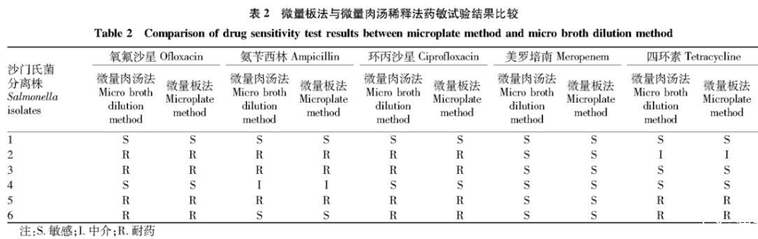 用配制好的标准浓度抗生素进行沙门氏菌药敏试验,结果显示(表2),不同沙门氏菌分离株对抗生素氧氟沙星、氨苄西林、环丙沙星、美罗培南、四环素或敏感或耐药。依据CLSI的最新判断标准,刃天青微量板与微量肉汤稀释法药敏试验得到的耐药结果一致。这表明用刃天青微量板法可以在短时间内更为直观地观察到耐药结果。但在检测沙门氏菌对美罗培南耐药性时发现,因为所用沙门氏菌对美罗培南均为完全敏感,可以观察到在耐药折点有些菌株会有极轻微的变色。