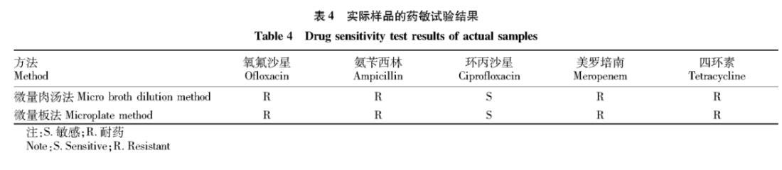 量板快速药敏试验,并同时进行微量肉汤稀释法药敏试验对照,结果显示(表4),2种药敏试验方法的结果具有良好的一致性。