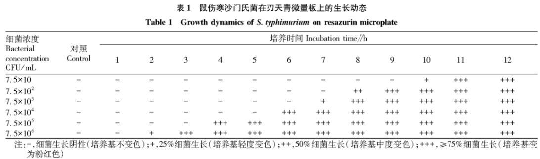 将不同浓度的沙门氏菌在刃天青微量板上培养12 h,每隔1 h观察结果。结果显示(表1),当细菌浓度为7.5×102、7.5×104和7.5×105 CFU/mL时,分别培养8、6和4 h即可见沙门氏菌生长;其中细菌浓度为7.5×10、7.5×103和7.5×106 CFU/mL时,分别在10、7和2 h显示为部分沙门氏菌生长。由此可见,刃天青微量板进行沙门氏菌药敏试验的判断时间可以控制在5 h。