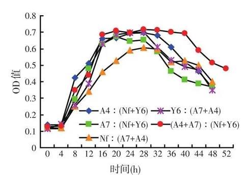 由图2可知,5组试验组达到稳定期的时间都比单独混合菌短,都在16~20 h之间,其中[(A4+A7)∶(Nf+Y6)]的稳定期时间为16 h。
