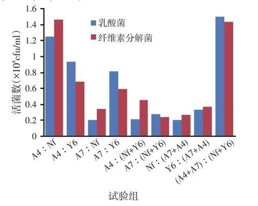 混合培养后活菌数见图3。在图3中可看出,乳酸菌活菌数在A4∶Nf、A7∶Y6、A4∶Y6、(A4+A7)∶(Nf+Y6)试验组中都较高,而纤维素分解菌在A4∶Nf、A7∶Y6、(A4+A7)∶(Nf+Y6)试验组中较高。两者均高的有A4∶Nf和(A4+A7)∶(Nf+Y6)试验组,其中(A4+A7)∶(Nf+Y6)试验组的最好。