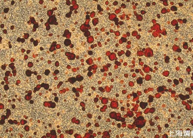 图1染色固定干燥后的胃癌细胞(中性红染色,×40)