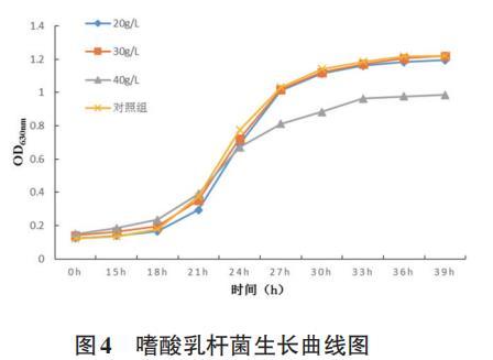 低聚果糖对嗜酸乳杆菌OD值的影响:通过测量嗜酸乳杆菌生长曲线,如图4所示,在转接后的15h内乳酸菌的生长比较缓慢,在15~30h内乳酸菌生长速度较快,在36h开始菌体浓度开始趋于稳定,此时嗜酸乳杆菌在630nm的OD值分别为:1.18、1.20、0.98、1.22。图4中,在24h时40g/L浓度组嗜酸乳杆菌的增殖速度开始降低;综上可知,40g/L浓度低聚果糖使嗜酸乳杆菌的增值速度降低,添加低聚果糖20g/L、30g/L与对照组接近无显著差异。